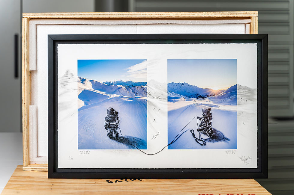 Through his gesture, Saype redraws and extends the fleeting dream of the moment. The gaze travels from large to small, from the monumental to the intimate. The gesture is unique, like a trace in the snow. Thus, every print becomes singular — a renewed ascent, roped together, toward a shared horizon.
